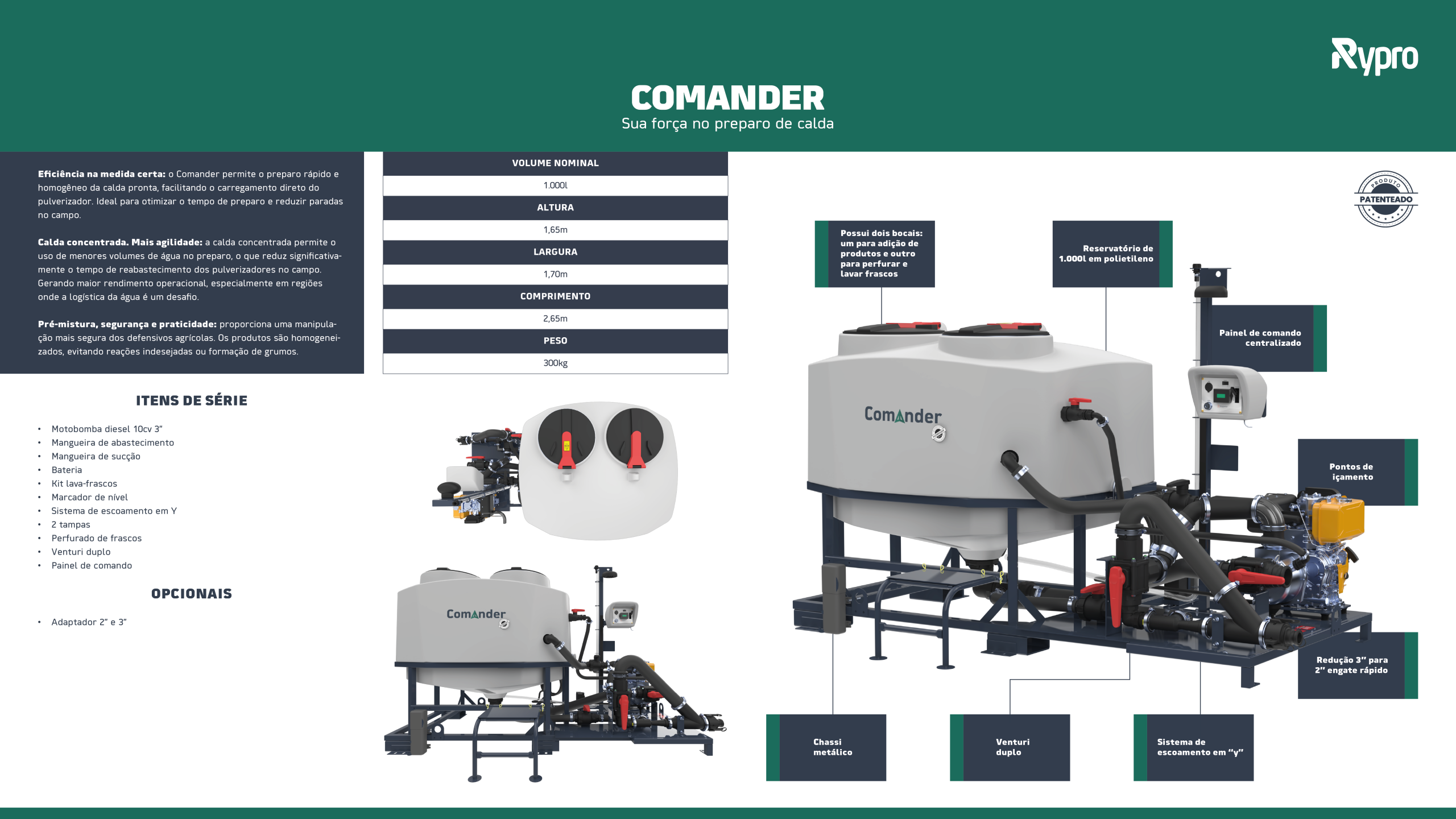 O Comander permite o preparo rápido e homogêneo da calda pronta, facilitando o carregamento direto do pulverizador. Ideal para otimizar o tempo de preparo e reduzir paradas no campo. Com sua estrutura robusta e sistema de mistura eficiente, o equipamento assegura que todos os componentes, líquidos ou sólidos, estejam perfeitamente diluídos, garantindo uma aplicação eficaz e segura dos defensivos agrícolas.