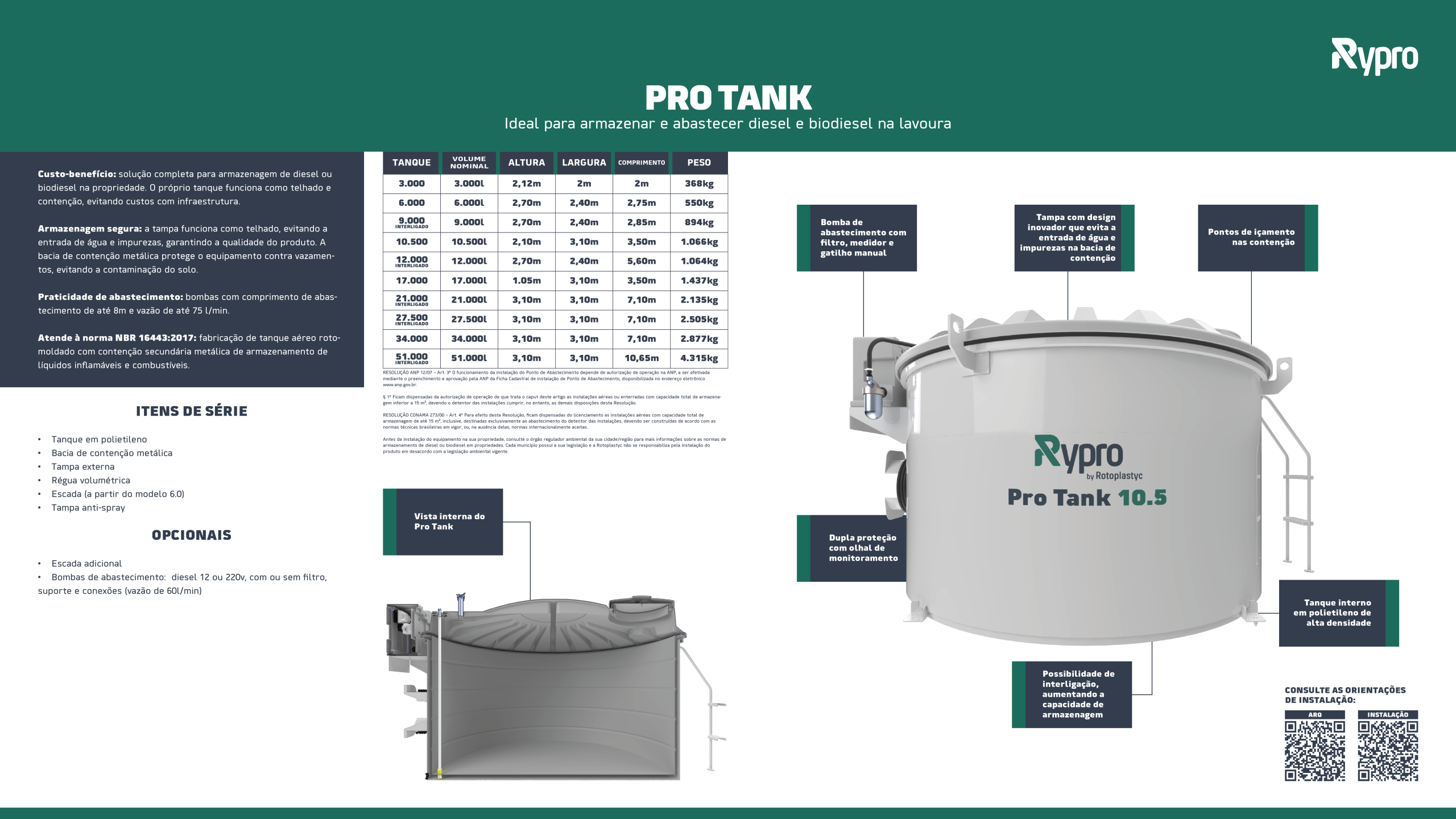 O Pro Tank é produzido em polietileno de alta densidade e possui uma bacia de contenção metálica, atendendo às normas de produção e armazenamento de combustíveis.